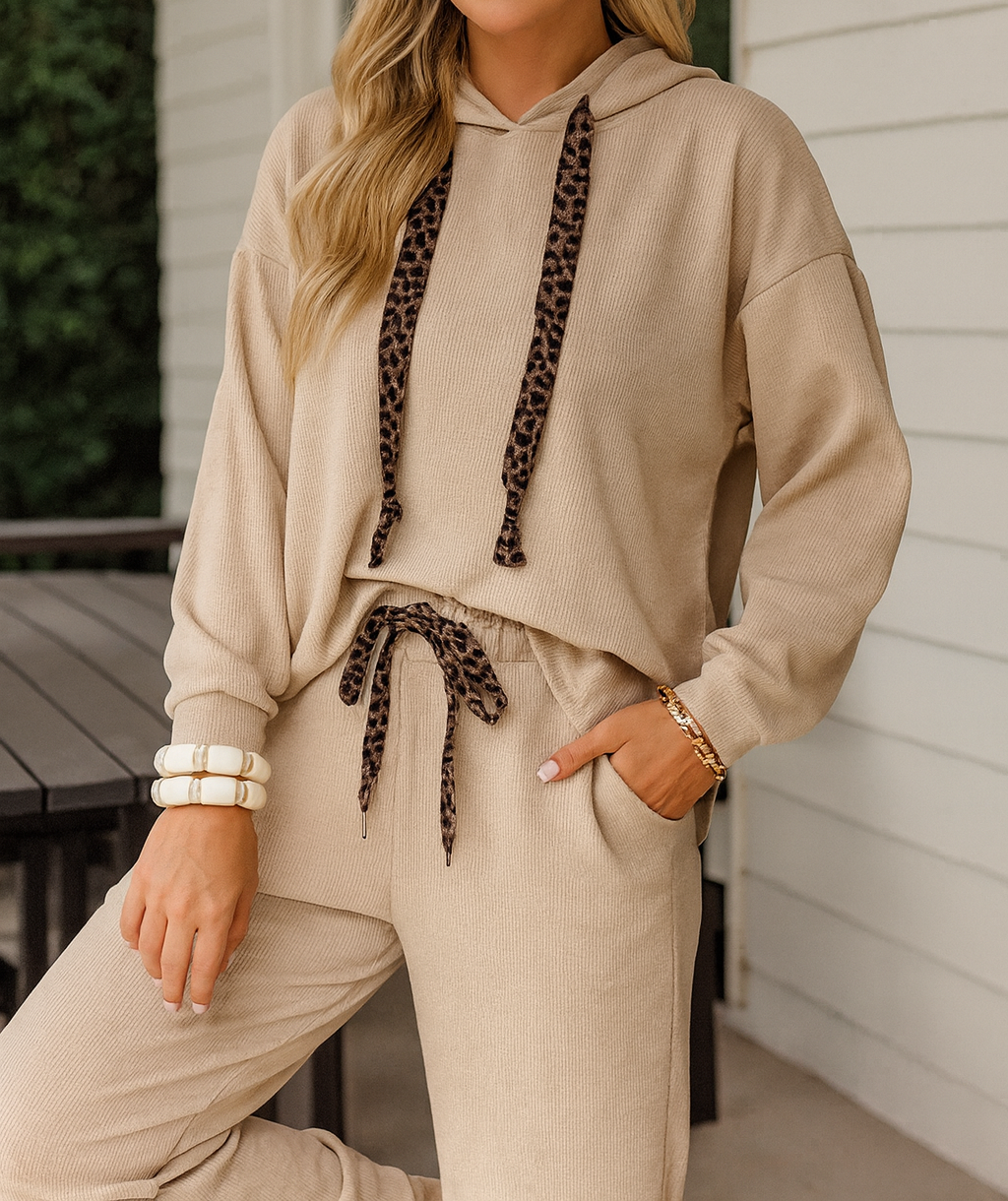 Elevate your wardrobe with the Beige Leopard Drawstring Set FB, featuring a chic lace and leopard drawstring detail. This 2-piece corduroy set includes a loose pullover hoodie with drop shoulders and high-waist tapered pants for a comfortable yet stylish fit. Perfectly coordinated, this suit set offers versatile style for any occasion, combining casual ease with a trendy edge.