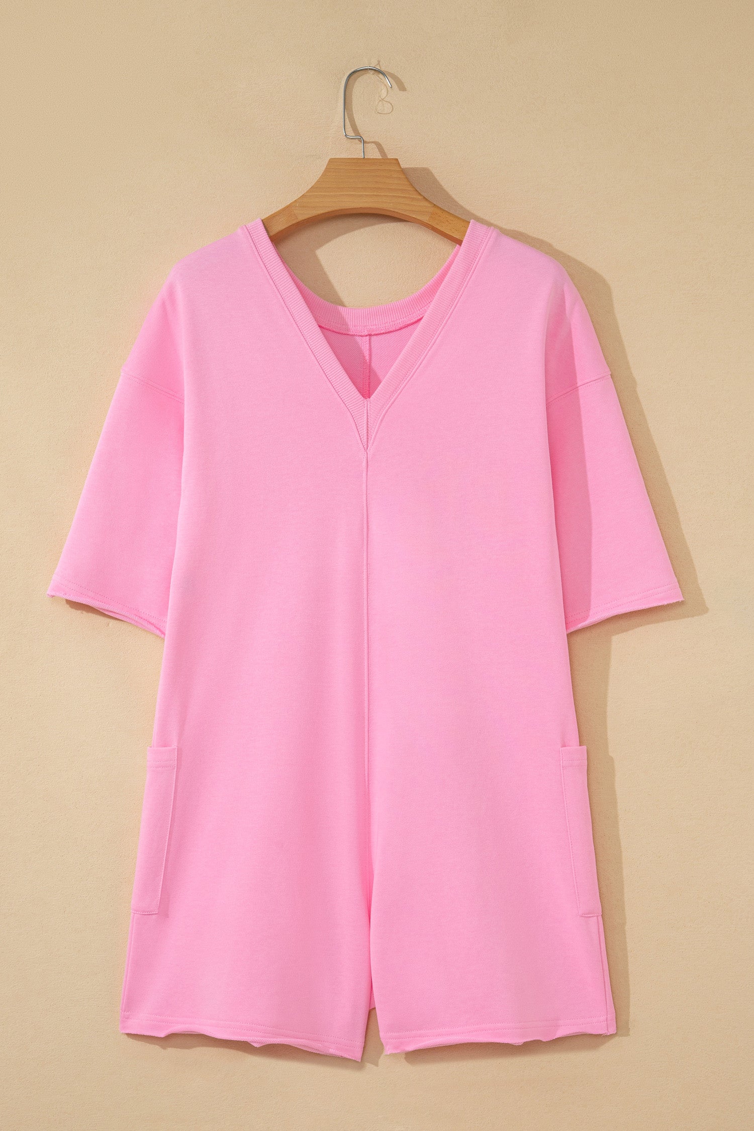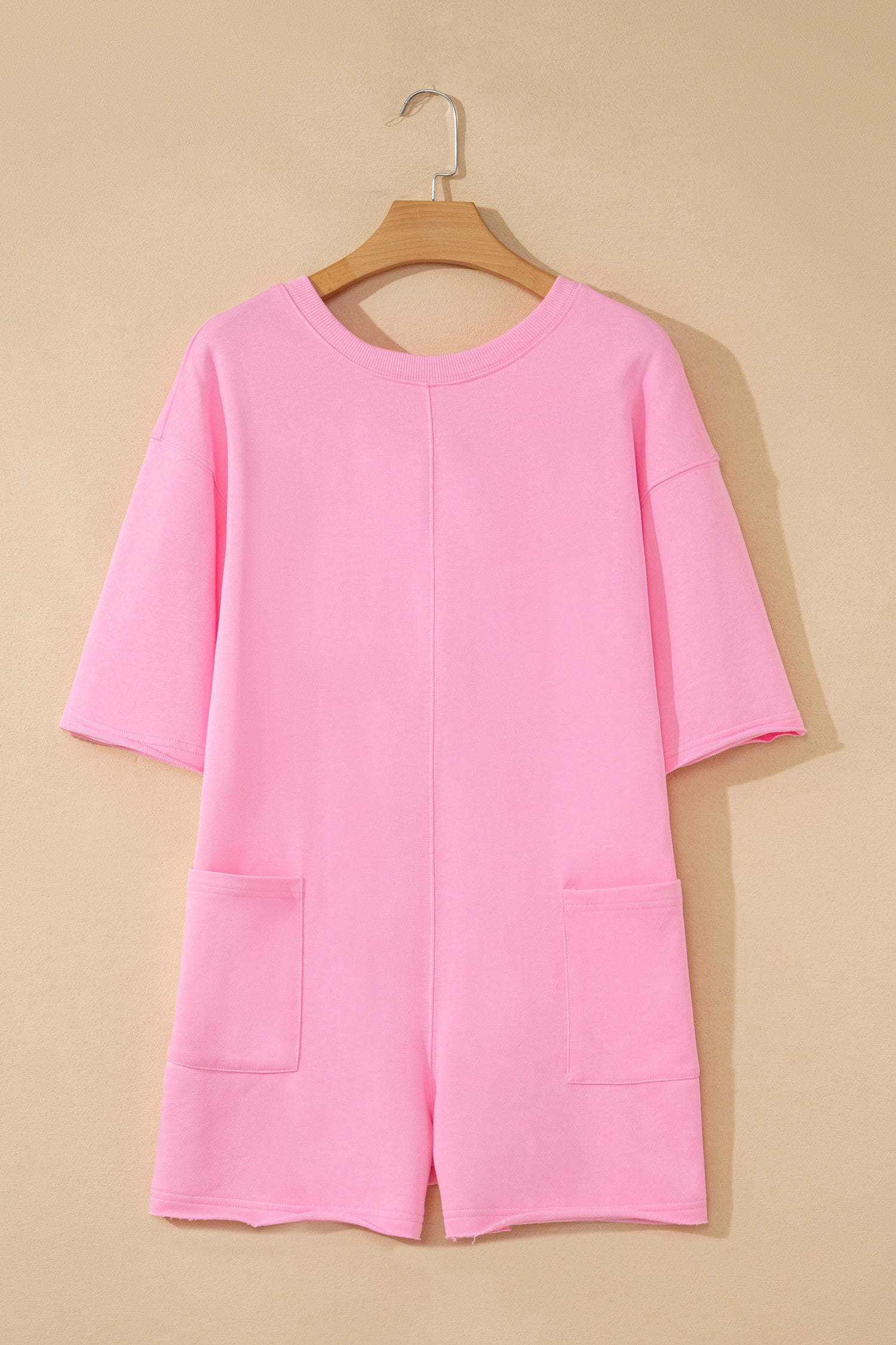 Effortless style meets everyday functionality in this pink loose romper. The solid color design offers versatile appeal that pairs seamlessly with any wardrobe, while raw edge detailing brings an on-trend, casual edge perfect for modern streetwear looks. Half sleeves deliver comfortable, relaxed coverage ideal for all-day wear, and practical pockets keep your essentials within reach. Whether you're running errands or meeting friends, this romper combines comfort and contemporary flair in one chic piece.